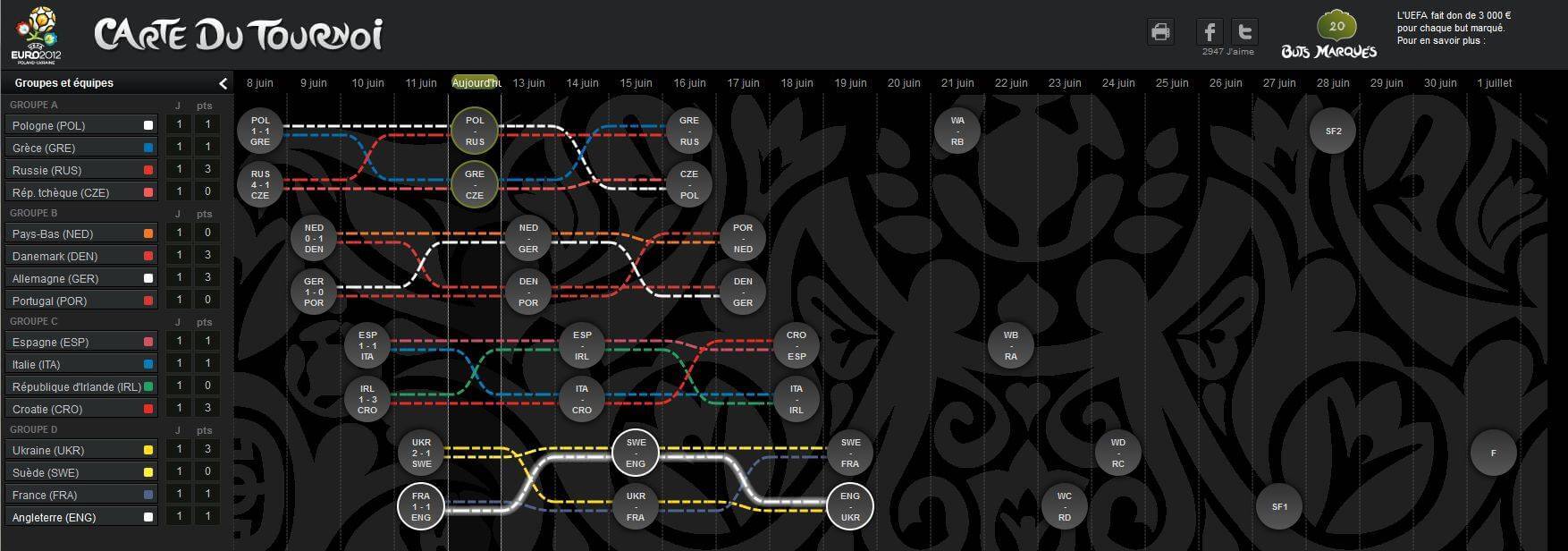 La meilleure chose à faire pour comprendre l’euro 2012 reste de se rendre directement sur le site de l’UEFA. Vous y découvrirez entre autre une carte interactive du tournoi très facile à lire, mise à jour à chaque résultat.